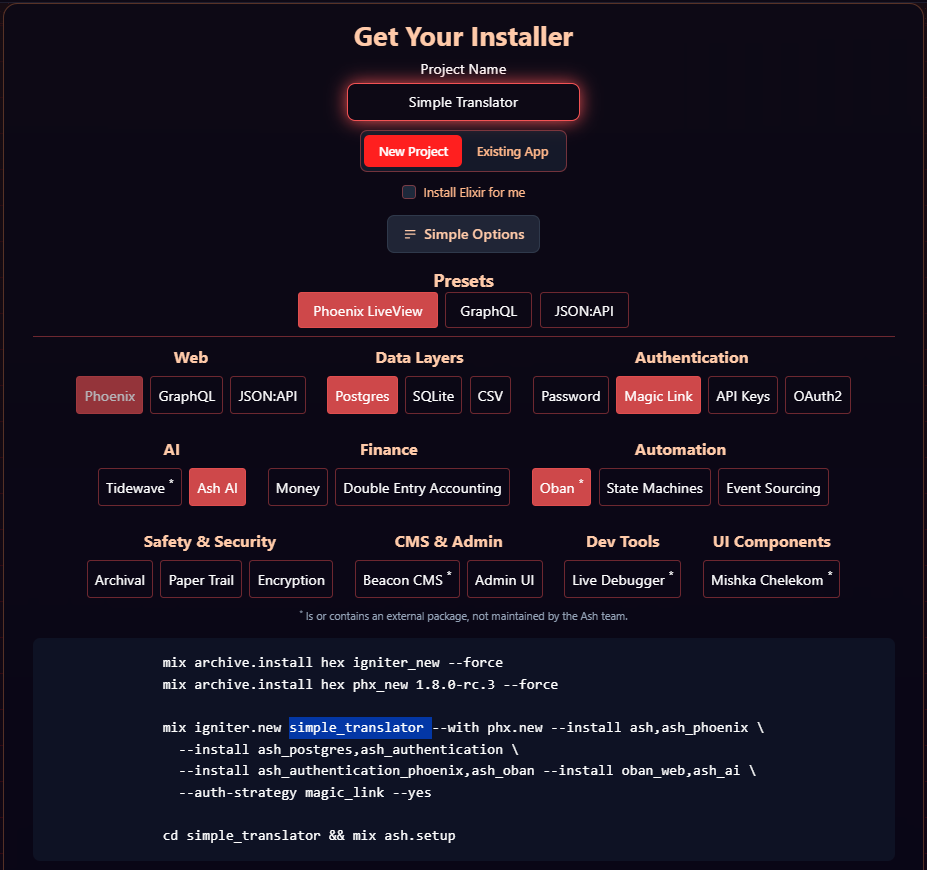 I named the project SimpleTranslator. I don't need to install Elixir and I added Ash AI (which comes with LangChain) and Oban. I removed Admin UI and Live Debugger because it's not relevant.